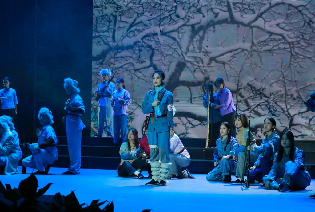 晚会以“再现红色经典”为主题,分为:一、岁月回响.原音重现;二、烽火岁月.时光回溯;三、时代赞歌.经典传承三个篇章,以歌唱、舞蹈、音乐剧、情景表演、器乐合奏、音画诗等丰富的形式展现了从五四运动到新中国成立这波澜壮阔的峥嵘岁月,其中包括了《狼牙山五壮士》、《映山红》、《觉醒年代》、《四渡赤水出奇兵》、《白毛女》、《黄河》等经典红色作品。演出让师生们在表演、观摩、学习的过程中深刻体会到了作品中的红色主题和精神力量。来自机制中本232班的谢庆魁扮演了狼牙山五壮士之一,他说这次表演让他对这段历史有了重新的认识,这种英勇无畏的精神就像狼牙山一般,将永远屹立在心中。服装设计221班的王伟悦在作品《松花江上》扮演了革命烈士赵一曼,她说道:“赵一曼牺牲前在她写给儿子的信中表达了她深深思念和愧疚,同时也表达了对祖国的热爱和对革命事业的坚定信念。我虽然只是短暂地扮演了赵一曼女士,但她大无畏的牺牲精神和可歌可泣的爱国精神深深的打动了我,并激励了我,要珍惜当下美好生活,为实现中华民族伟大复兴贡献自己的力量!”